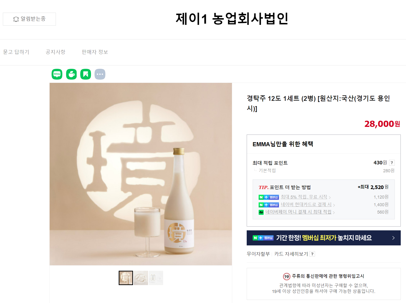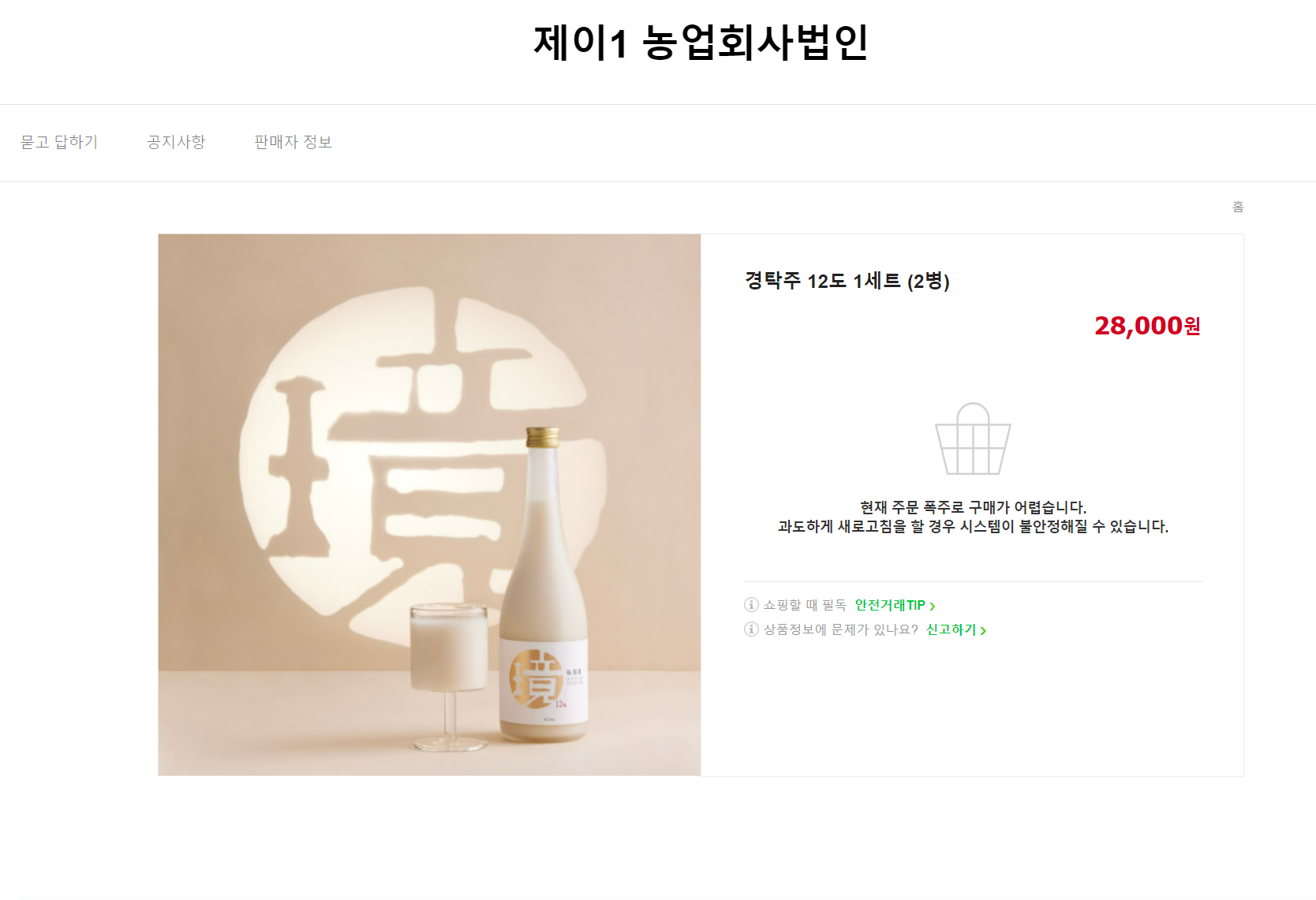 오늘(22일) 오전 11시 처음으로 판매되었던 성시경 막걸리, 경탁주 12도