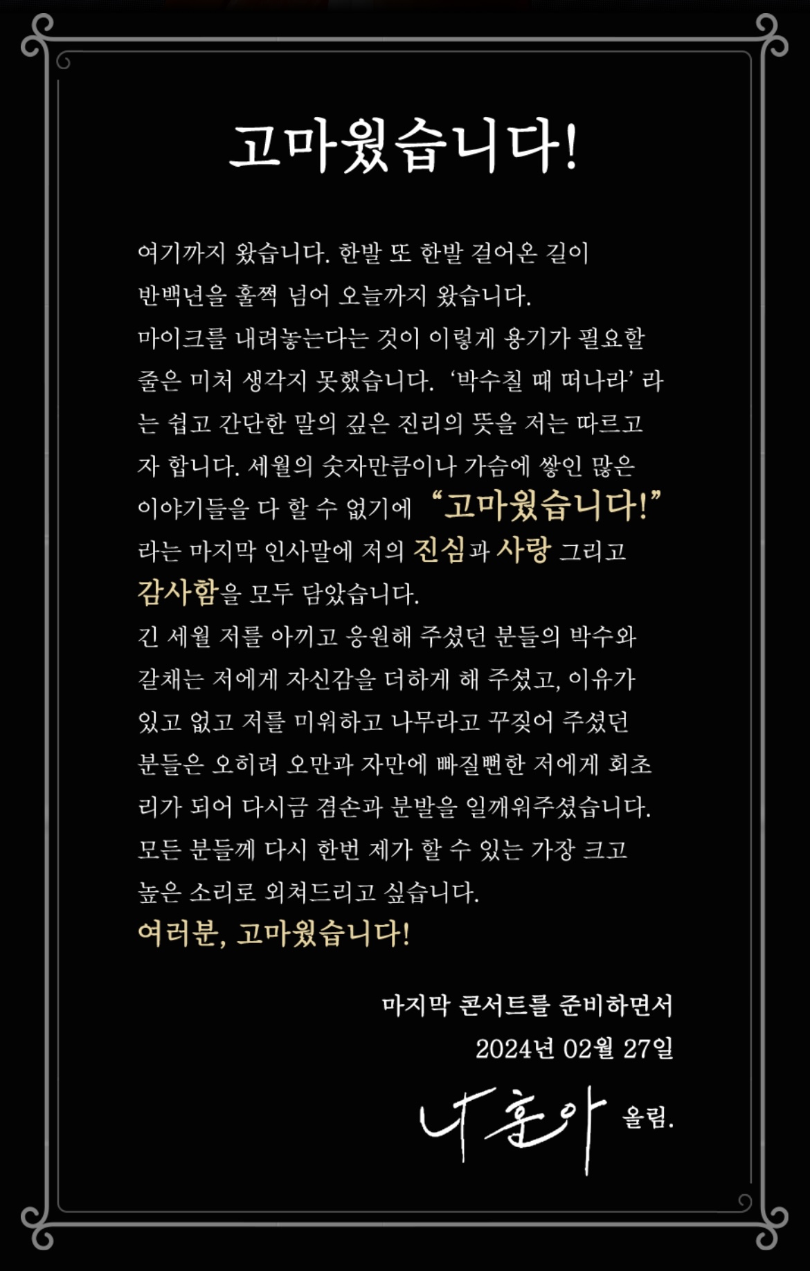 나훈아티켓 홈페이지에 올라온 은퇴를 암시하는 나훈아의 인사말과 함께 티켓오픈 일정도 공개됐다.